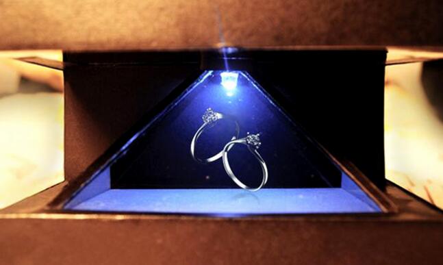 360度全息柜,360度全息柜呈金字塔形,頂部四面透明,可以從360度的任意角度觀看3D圖像。成像顏色、對比度、清晰度都很好,空間感和透視性也很強,帶來很好的立體成像效果和裸眼3D效果。